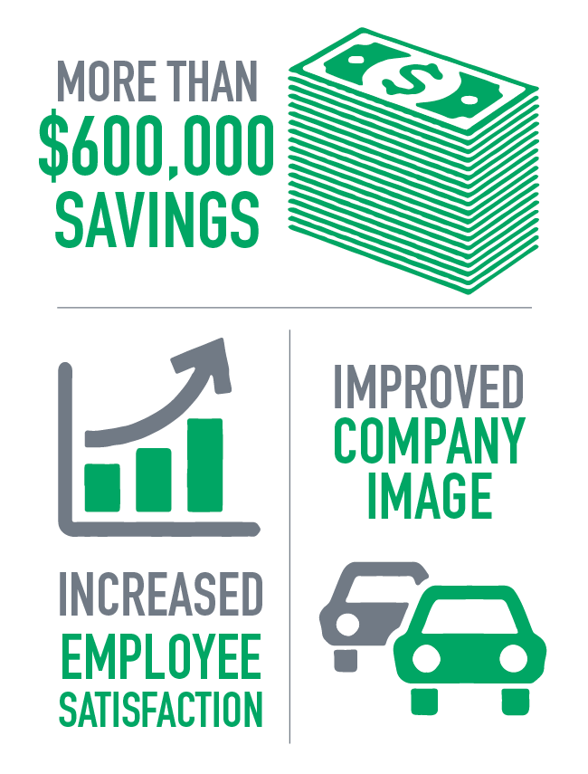With the growth of the home health and hospice division of Forrest General Hospital, employee mileage reimbursement had increased to 1.9M business miles per year. Reimbursing employees at the IRS rate of $0.55/mile resulted in a $1.045MM reimbursement cost. Employees operating personal vehicles created an inconsistent image for the company and safety concerns.