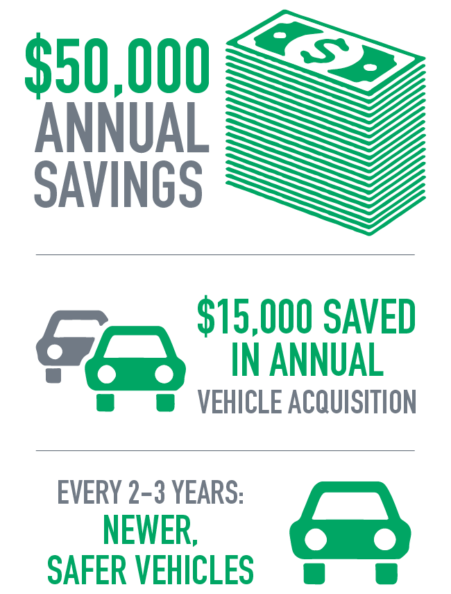 Enterprise Fleet Management worked with JBC to analyze the best vehicle program for their business and how to optimize their fleet investment. JBC was able to lower their cost per mile by selecting a fleet of trucks that met their business needs. The government reimbursement rate was $0.56, compared to the $0.34 expense with a new fleet program. The fleet program also reduced their safety concerns by providing each employee with an insured, company owned vehicle.