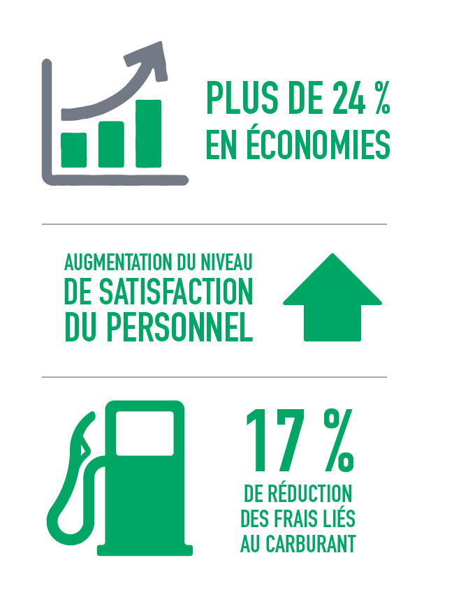 Enterprise Fleet Management a aidé le Groupe Lancaster à analyser l’ensemble de leur parc de véhicules pour déterminer quels types de véhicules convenaient le mieux à leurs besoins organisationnels. Une stratégie de parc personnalisée a été mise en œuvre pour aider le Lancaster Group à se concentrer sur la planification à long terme, en fournissant des processus de rapports et en réduisant ses dépenses d'exploitation globales. L’entreprise a lancé son nouveau plan de parc progressivement avec quelques remplacements de véhicules. Le plan comprenait le programme télématique Geotab pour accroître l'efficacité et la sécurité. Les programmes d’entretien complet et de gestion de l’entretien ont permis d’économiser des ressources administratives en éliminant les négociations continues en matière d’entretien et en empêchant les réparations inutiles.